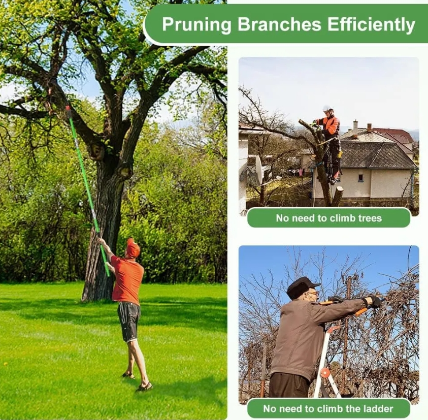 A proper tool will double the efficiency. The blades of the LUCKUP TREE PRUNER POLE SAW are made of durable alloy steel, which is not easy to bend and break. The epoxy resin pole is lightweight and has a high load-bearing capacity, as well as good insulating properties. 26 feet extension pole tree pruner allows you to easily prune high branches on tall trees and do it without the hazard of climbing the ladder.