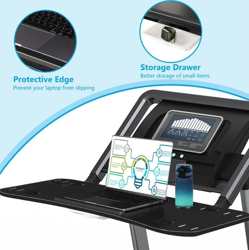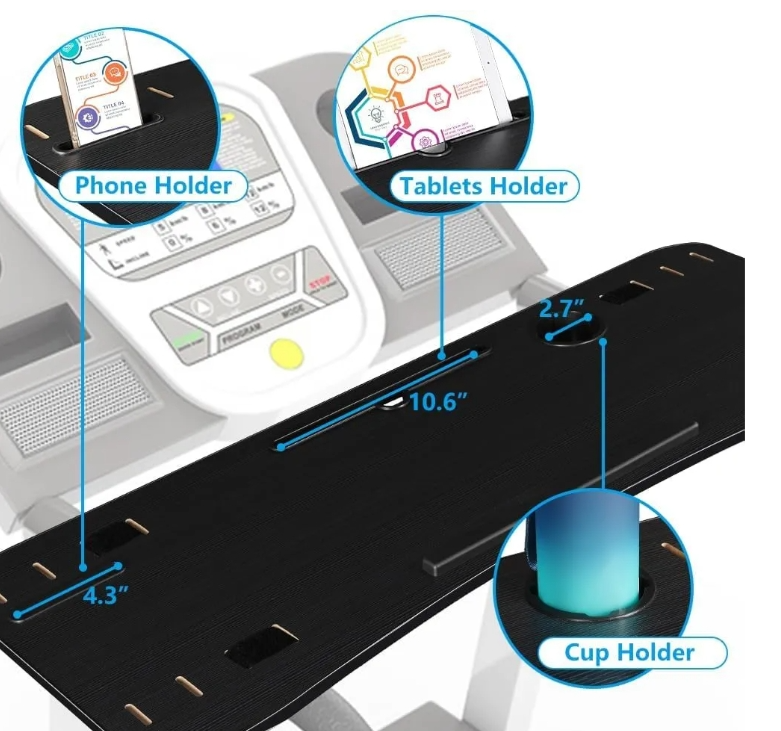 3. Multitasking: With a tablet within easy reach, you can catch up on emails, read articles, or even attend virtual meetings while walking or jogging on the treadmill. This multitasking capability allows you to make the most of your time and stay productive without sacrificing your fitness goals.An edge protective guard of universal treadmill desktop protects your laptop from falling. Equipped with slots to hold phones, tablets, laptops, and cups, protect items from slipping.