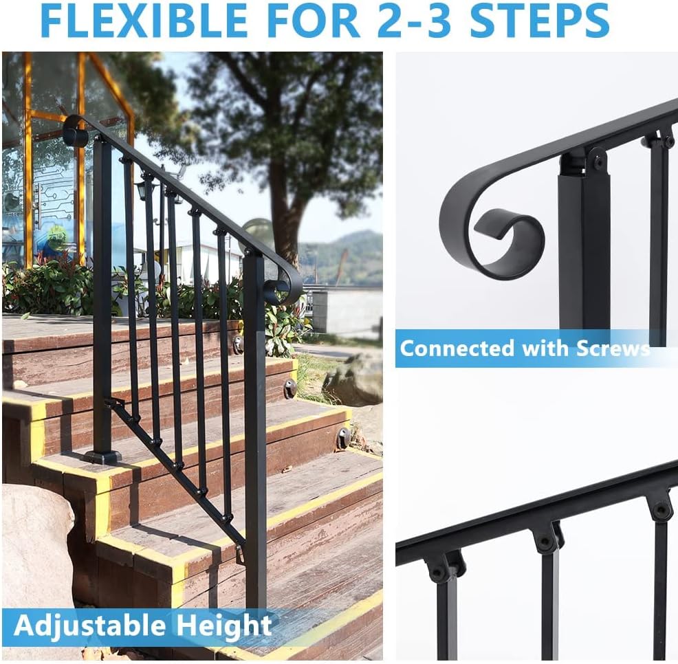 The ends of outdoor step railings are designed with beautiful curved shade to complement proch railing. Can be mounted on any surface, like concrete, wood, and metal.