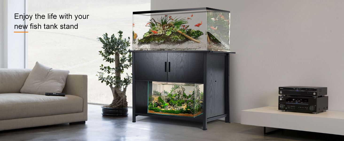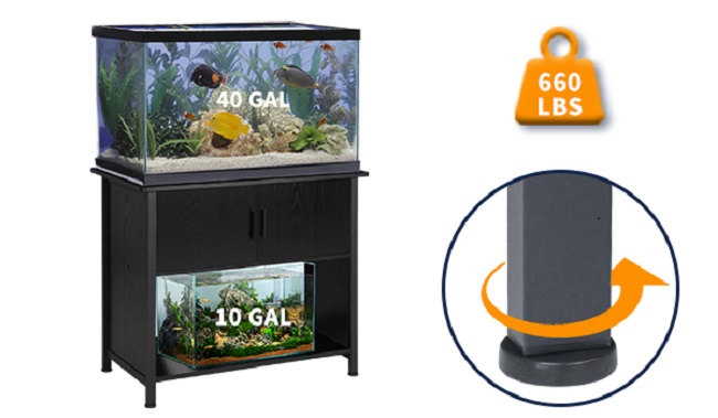 High Load Capacity and Stability: Our aquarium stand combines a sturdy iron frame with reinforced wooden planks to provide remarkable load capacity and unwavering stability. Safely supporting aquariums up to 40 gallons, with a maximum load capacity of 660 pounds, this stand ensures your aquarium remains secure and balanced. With adjustable feet for leveling, say goodbye to wobbling or tilting tanks, creating a safe and stable environment for your aquatic companions.