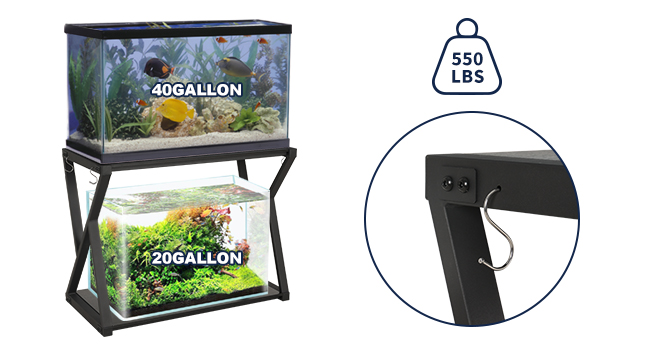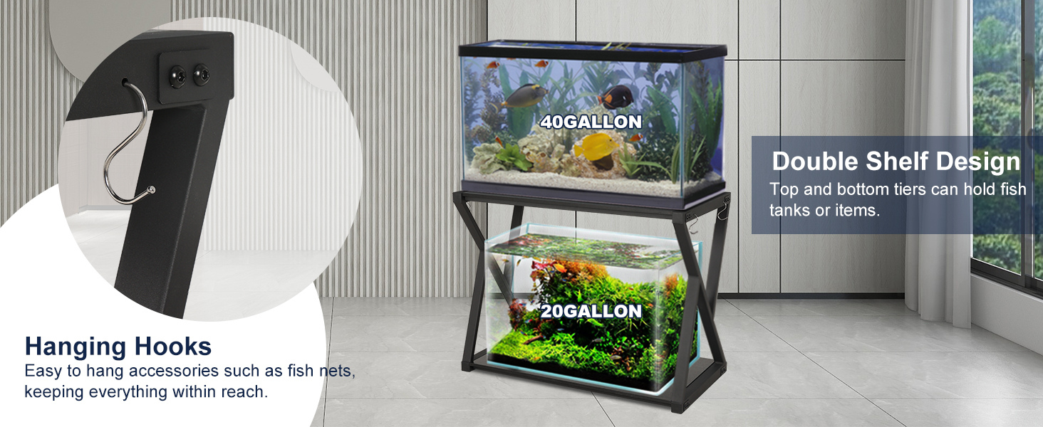 Spacious Storage: The dual-layer design of the aquarium stand provides ample storage space for all your aquarium essentials. With hooks on both sides, you can conveniently hang accessories such as nets, brushes, and thermometers, keeping everything within reach.