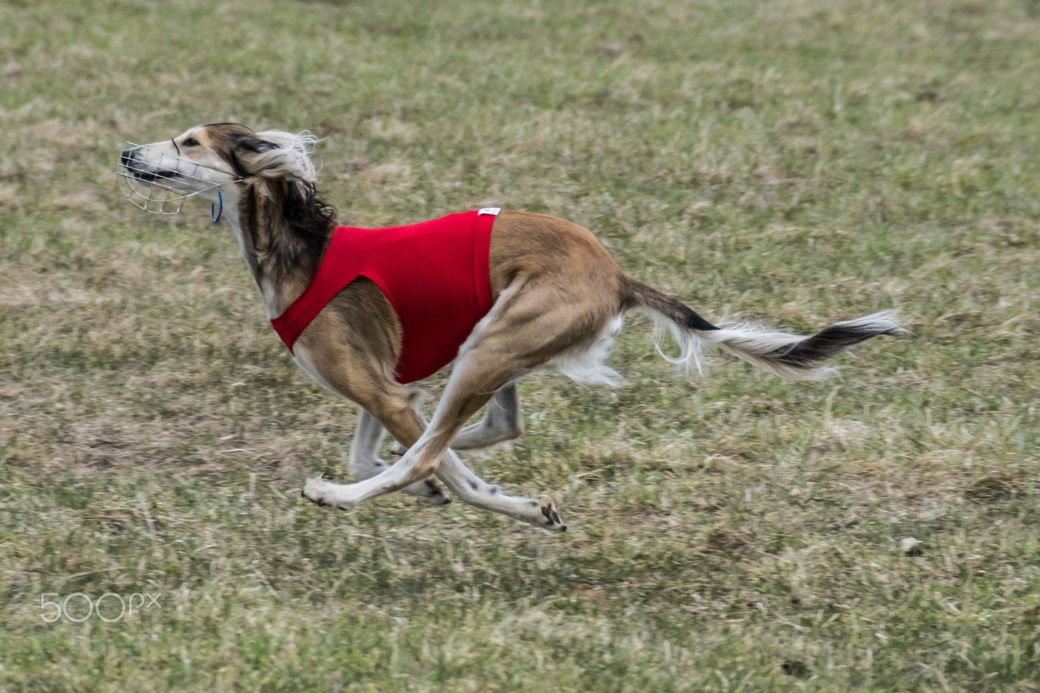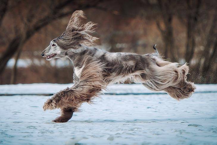 The Russian Wolfhound is a large Russian wolf hunter, they are 69-79 centimeters tall, weigh 35-48 kilograms and run at a top speed of 58 kilometers per hour. Despite their size, this breed is very fast and is used to hunt and chase prey across the steppes. As you can see from the name, they used to be primarily used for hunting wolves, and usually strike in pairs, and would wrestle the captured wolves to the ground by the neck.